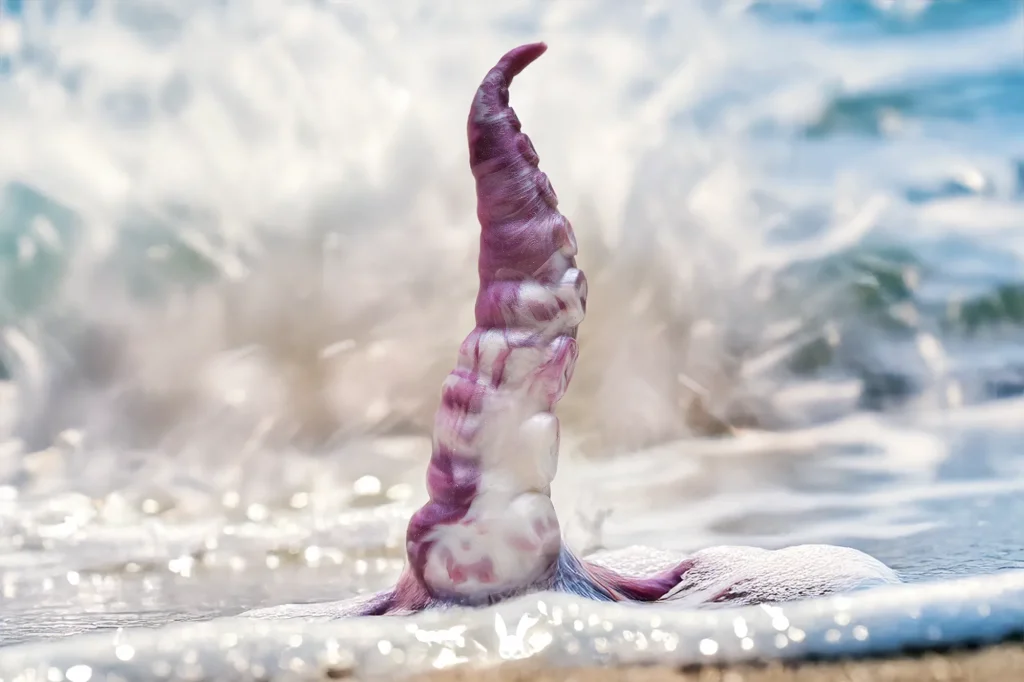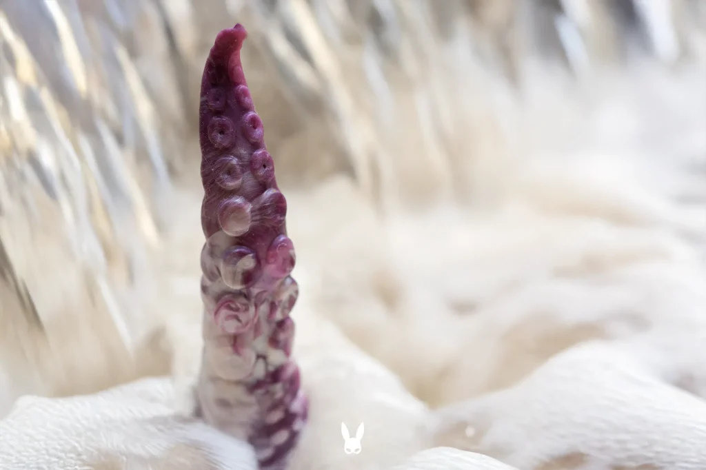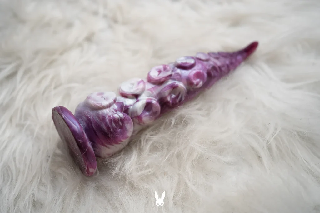 A Fantasy Dragon Mystical Tantacle fantáziadildó mintha egy másik világból érkezett volna: organikus formái, hullámzó vonalai és csápszerű nyúlványa az ismeretlen mélységeket és mitikus lényeket idézik. Nem a valóságot akarja másolni, hanem egy különleges, fantáziadús élményt kínál már pusztán a megjelenésével is. Az egyszerűség kedvéért induljunk lentről. Egy egyszerű talp részt kapunk, ami szépen egyensúlyozza az eszközt, bár ebben az esetben sem találkozhatunk tapadókoronggal. A vaskos, 4 cm átmérőjű csáp innen indul, rendíthetetlen tör az ég felé. Hatalmas tapadókorongok törik meg az izom és inak által formált tapintószerv testét. Ahogy haladunk a dildó testén felfelé, úgy csökken az átmérőnk és úgy csökkennek a tapadókorongok és az izmok által formált domború felületek váltakozása. A csáp teteje enyhén hajlított és a legvége szinte hegyesen, bevetésre készen néz velünk farkasszemet. Egyszerűen lenyűgöző, milyen aprólékosan kidolgozott ez a forma, és mennyire szépen sikerült a kivitelezés. Se hibák, se görcsök, se puklik – a felület teljesen egységes, szép, illesztésnek nyoma sincs. Az anyagválasztás pedig csak hab a tortán: a Fantasy Dragon platinum minőségű szilikonja kellemes tapintású, jó fogást ad, és igazán masszív érzetet kölcsönöz a dildónak. A színválasztás merész, fehér és lila keveredik hullámformában, akárcsak a fodrozódó tenger.