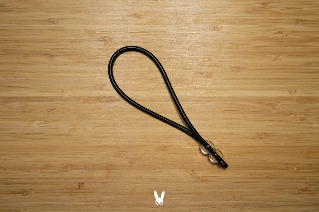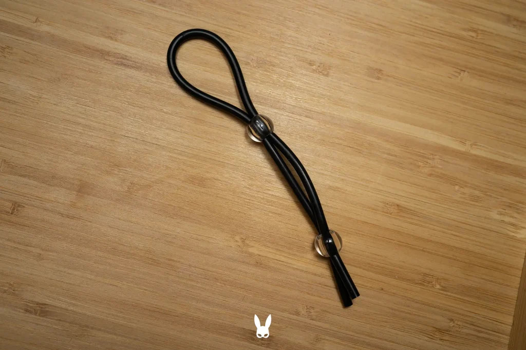 Az eszköz lényegében három részből áll: egy fényes fekete szilikon “madzagból”, illetve két összehúzó gyöngyből, amik a méretállítás lehetőségét szolgálják. Ami számunkra feltűnő, hogy a “madzag” része vékonyabb a szokásosnál. Ez alatt a hagyományos péniszgyűrűkre is és az állíthatóakra is gondolok, hisz nagyjából 4 mm-es átmérővel rendelkezik.